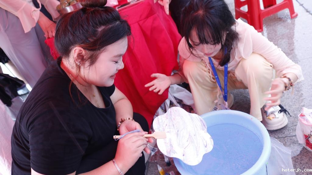非遗漆扇体验现场,师生用矿物颜料在扇面、布袋上绘制龙舟、艾草等端午元素,传统漆艺与现代审美碰撞出独特创意,不少同学表示要将亲手设计的扇子作为节日礼物;粽叶书法摊位前,书法爱好者以粽叶为纸、墨汁为笔,在叶脉间书写“安康”“祈福”等字样,让传统书法艺术在粽叶上焕发新生;端午套圈与猜谜语区域则人气爆棚,艾草香囊、端午书签等文创奖品琳琅满目,谜题涵盖屈原生平、端午食俗等知识,让参与者在趣味中汲取文化养分。