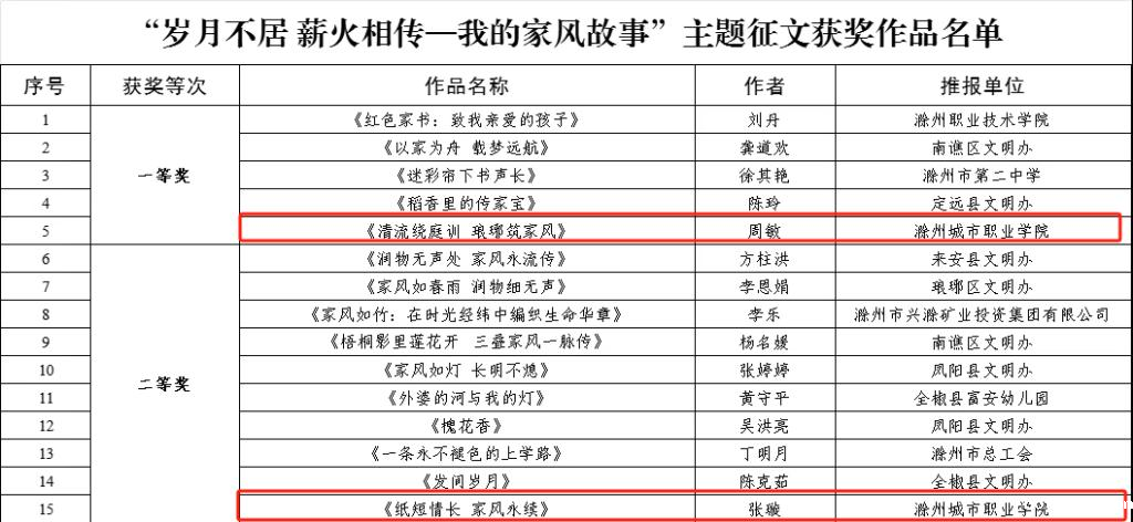 喜报:我校两位教师在滁州市“岁月不居 薪火相传——我的家风故事”主题征文活动中斩获佳绩